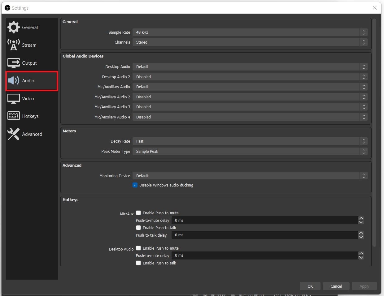 Open up OBS Studio and navigate to your Audio settings. Set the Sample Rate to 48 kHz, Channels to Stereo, and select the microphone you want to use as your Mic/Auxiliary Audio device.
