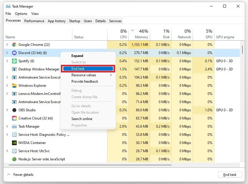 Prevent programs from running on your PC that can change your audio devices while using OBS Studio. To do so, search for Task Manager in your start menu search to open it up. In the Processes tab, right-click the programs which could change your audio device’s properties and select End Task.