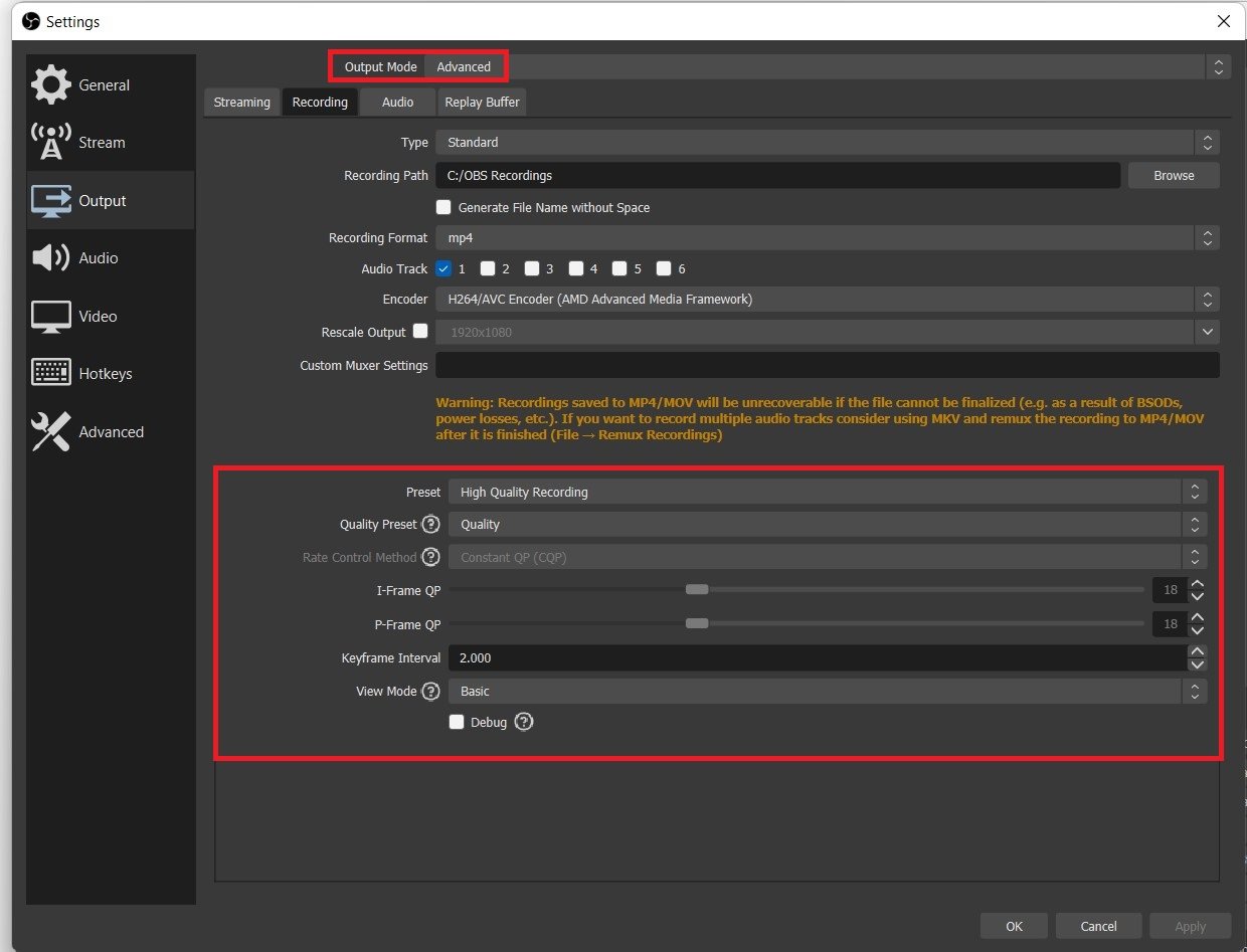 Lastly, we will take a quick look at your OBS Studio settings. Under Output, set the Output Mode to Advanced and in the Recording section, set the type to standard. Set the recording path to where you want your recordings to be saved. If you plan to make many recordings, we suggest using a file path in your storage partition with the most available space. We prefer to use .mp4 as my recording format, as the file size remains low compared to other formats, and it’s usable in every video editing software.