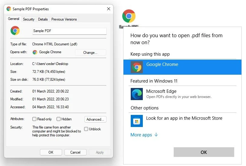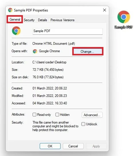 After converting a file into, or after downloading a PDF file to your system, you used to see an Adobe Reader icon for your PDF files, and now that the Google Chrome icon has replaced this icon, the file will open up in your browser. You can quickly change this by right-clicking the icon and selecting Properties.