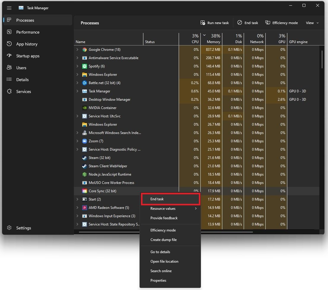 If you still get network-related issues, you most likely have software running on your system, hindering you from playing the game. To fix this, I suggest ending processes in your Task Manager of recently installed programs that can change your files or use up your available resources, such as OBS, Shadowplay, CCleaner, or Adobe applications, to troubleshoot which program is causing the issue.