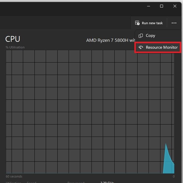 Open your Task Manager by searching for it in your Start Menu search. In the Performance tab, select Resource Monitor.