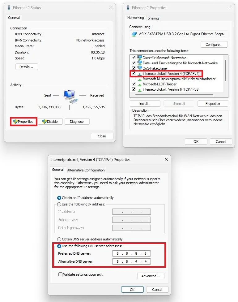 This will open up this window, containing some general information about your connection. Navigate to Properties, and lastly, double-click the Internet Protocol Version 4. Select to Use the following DNS server addresses option, and as your Preferred DNS server, use: 8.8.8.8, and as your Alternate DNS server, use: 8.8.4.4. This will, for many users, fix network-related issues when playing Overwatch 2, as these are the official public DNS server addresses from Google, which are safe to use.