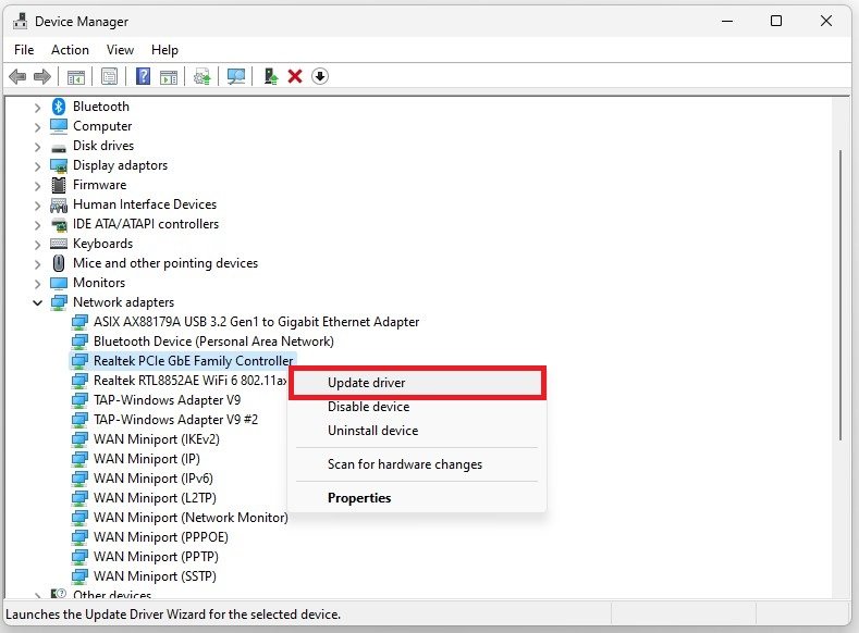 To further troubleshoot network-related problems, I suggest updating your Network Adapter’s driver. To do so, search for Device Manager in your start menu search to open it up. Expand your Network Adapters, right-click the one you are using, and select Update Driver. Finally, click on Search automatically for drivers. This will take a second to download and install the latest Network Adapter driver.
