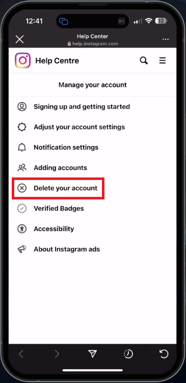 In case you're unable to locate the "Delete Account" option, simply return to your primary Instagram account settings. Select "Help" followed by "Help Center" to proceed.