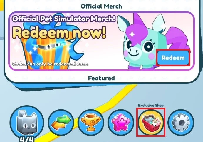 First, on your mobile device or PC, open up Roblox and join a Pet Simulator X server. After loading into the game, click on the pet button at the bottom of your window. From here, navigate to the Exclusive Shop and click on Redeem to access the code redemption dialogue box. There used to be a second redeem menu item, but all codes can be redeemed here.