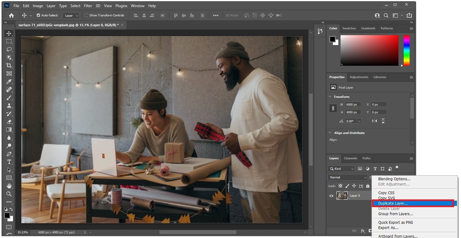 After importing your image to Photoshop, we suggest duplicating the image layer, in case you make a mistake. Simply right-click the layer and select Duplicate Layer.
