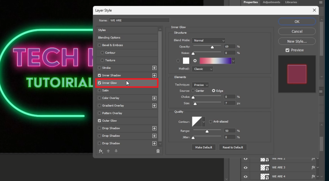 By accessing the “Layer Style” window, you can tweak settings like “Outer Glow” and “Shadow”. This allows you to control the intensity and spread of your neon's illumination.
