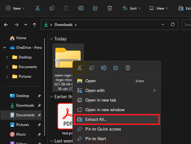 For Windows users: Right-click on the .zip file and choose 'Extract Here' within the downloads folder.