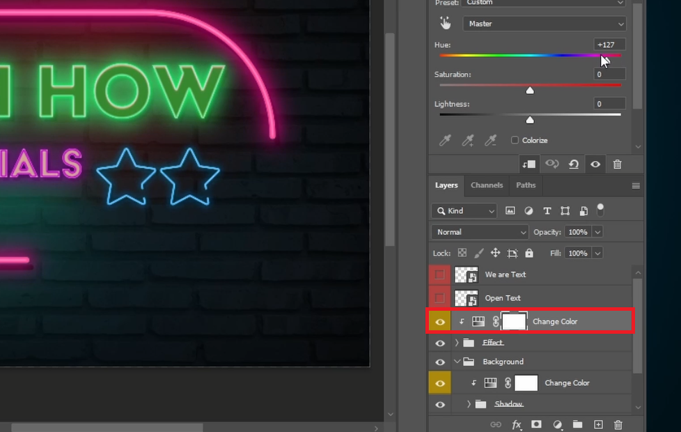 The "Change Color" layer lets you modify the hue, saturation, and lightness of your design. It's especially useful when adjusting the neon effect to achieve different color variations.