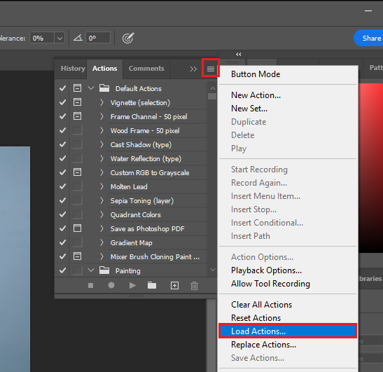 Start by heading over to the 'Window' in your menu bar and choosing 'Actions'. Here, you will find a small menu icon on the top-right corner, click on it and select 'Load Actions'.