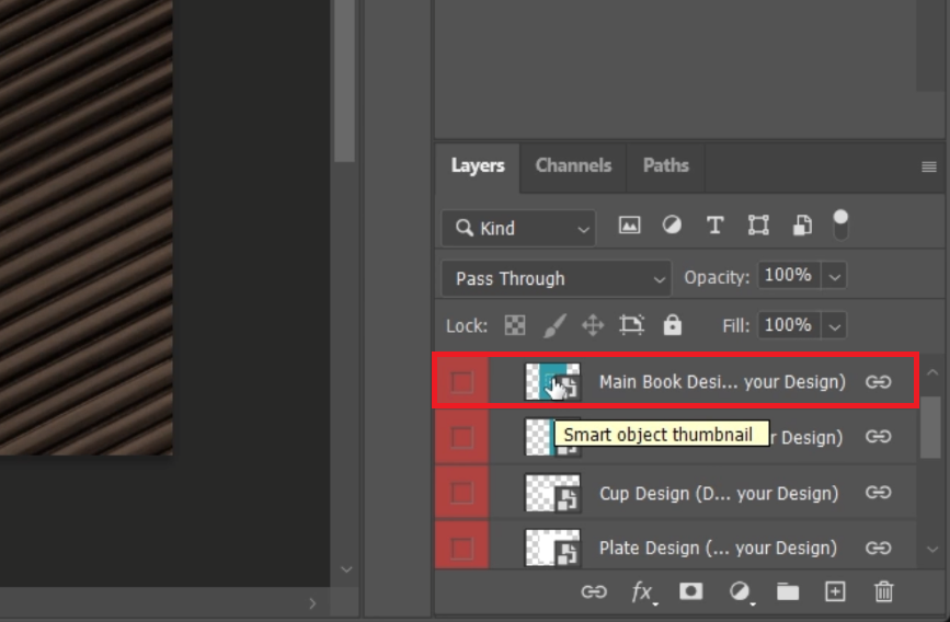 Navigate the Layers: In the Photoshop interface, focus on the 'Layers' section, typically located at the bottom right. Here, locate and open the folder named "book." You'll find four 'Smart Object' layers inside, each allowing customization of different elements in your design.