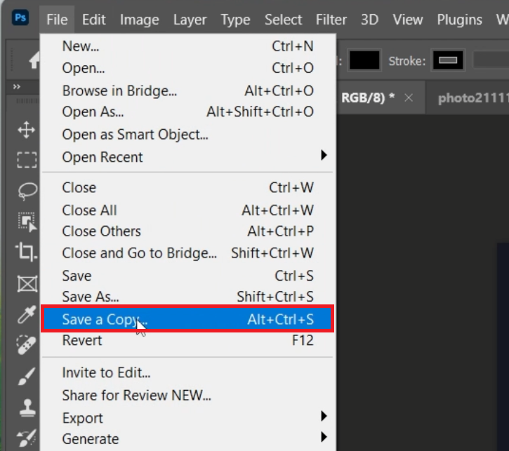 Click on 'File' in the Photoshop toolbar at the top of the screen.