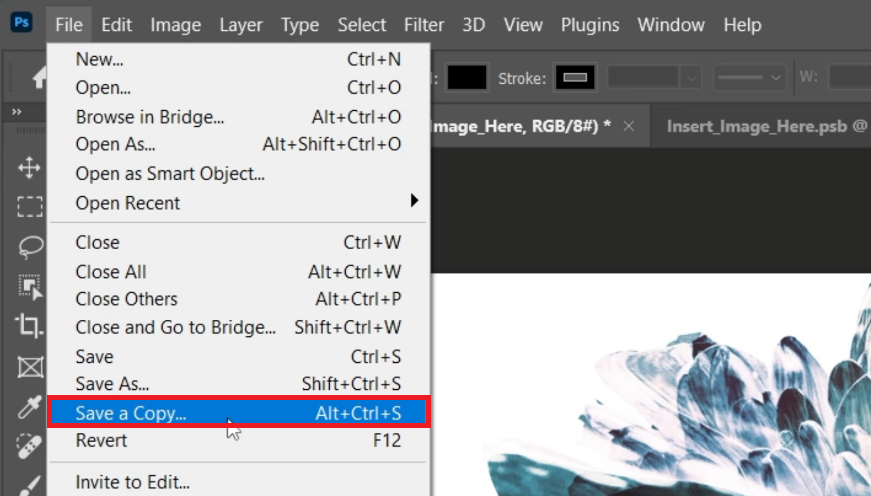 Photoshop > File > Save A Copy…