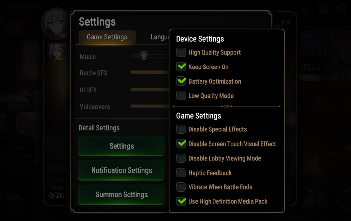 After launching Epic Seven, select your avatar and navigate your in-game settings. Under Detail Settings, you can change the game's overall texture and detail quality. Set this option to High-Quality Support to set it to the highest value. This might cause lag on lower-end PCs or a Mac. In your Game Settings, you should disable haptic feedback and the vibrate option, as you have no use for them on your PC. In your Account Settings, you can log out and switch accounts.