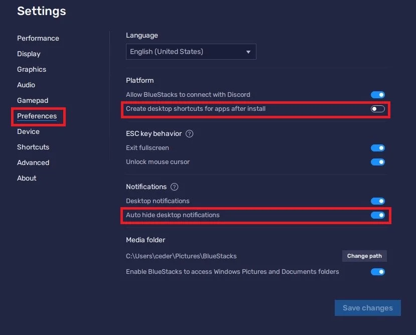 After saving your changes, navigate to your Preferences tab. We like to disable the Create desktop shortcuts for apps after install option and enable the Auto-hide desktop notifications option when in-game. We suggest looking at the other settings, but for now, you should be fine when playing Free Fire for the first time.