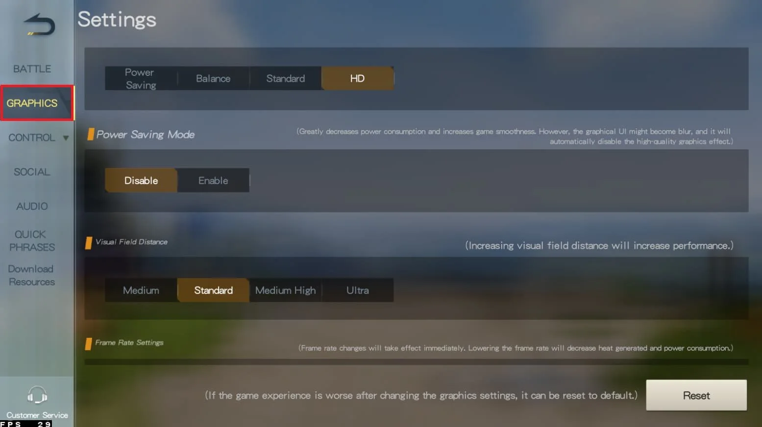 In the Graphics section of the game settings, lower the graphics quality if you experience lag or performance issues. Disable Power Saving Mode and increase the frame rate to Highest or Super High, depending on your PC's capabilities.