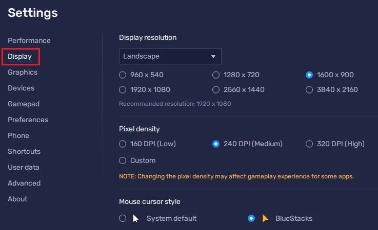 BlueStacks Settings > Display