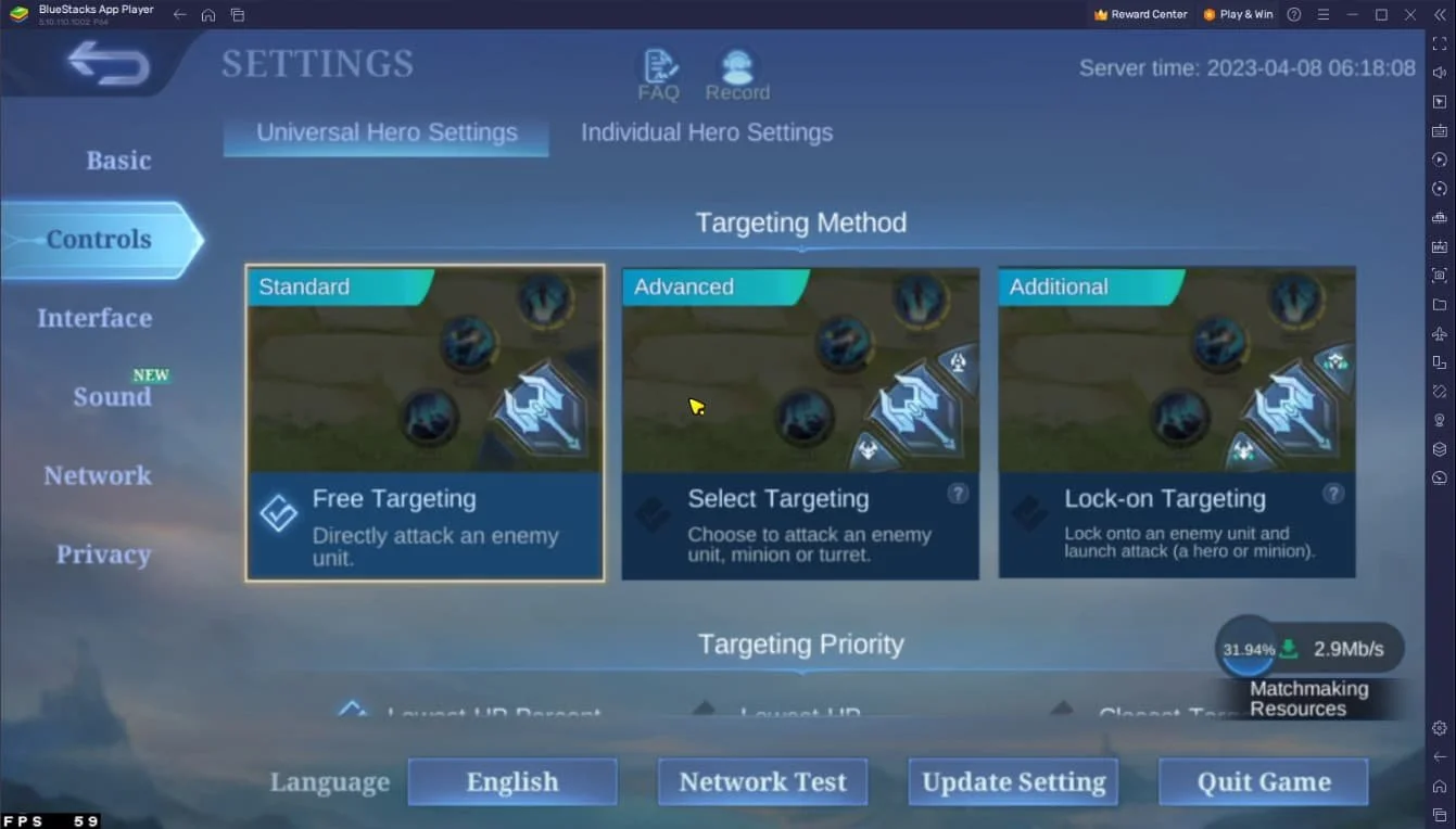 Next, head over to the Controls section and choose either "Standard" or "Advanced" for the Targeting Method option. Here, you can also fine-tune advanced control mode options, joystick settings, and more to suit your preferences.