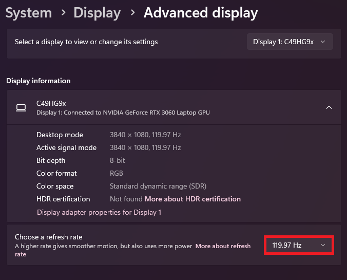 Windows Settings > System > Display > Advanced Display