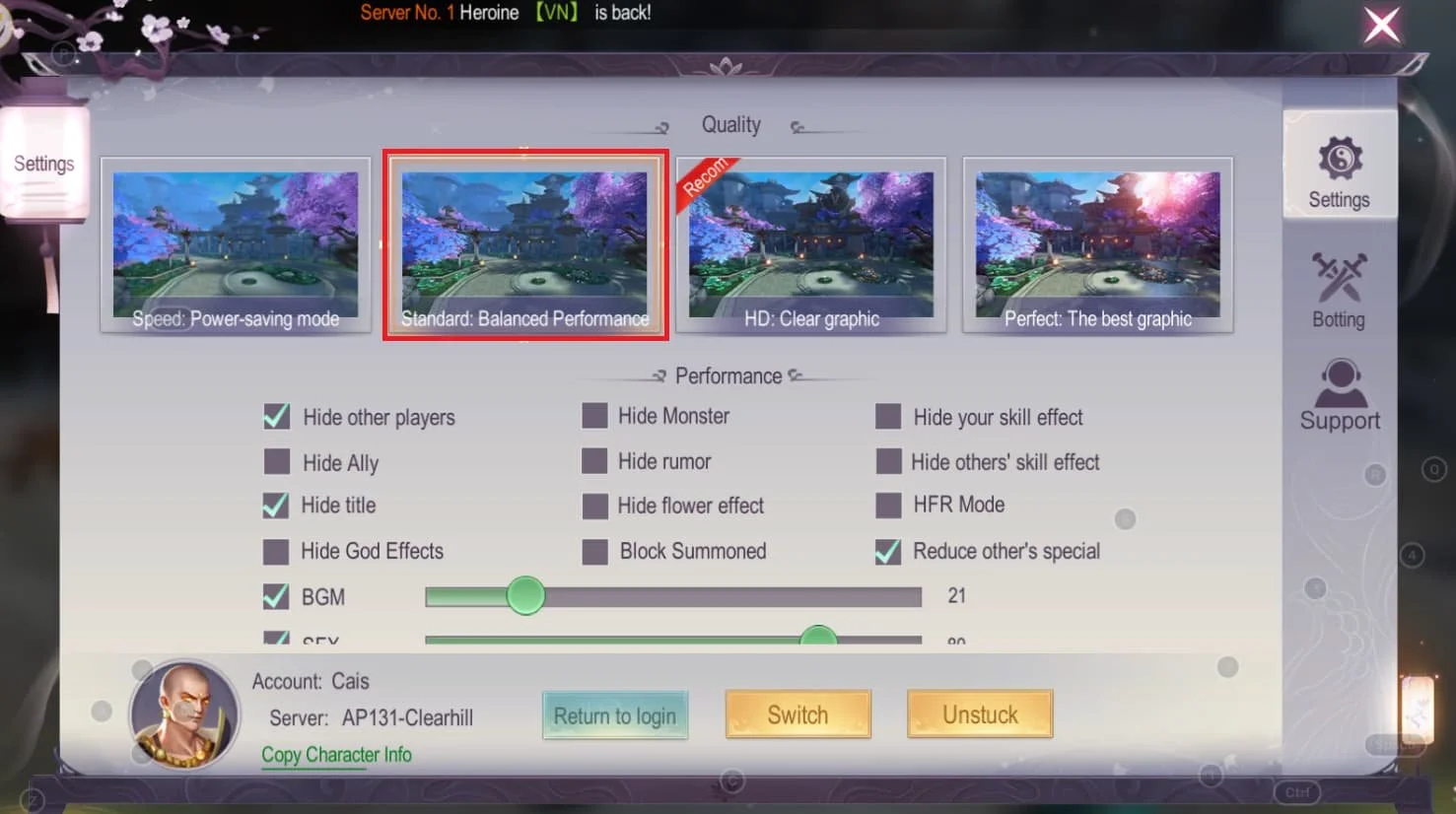 To improve performance, head to the in-game settings and lower the graphics quality preset from "Clear Graphic" to "Standard: Balanced Performance." This will help maintain a stable frame rate, especially on low-end devices.