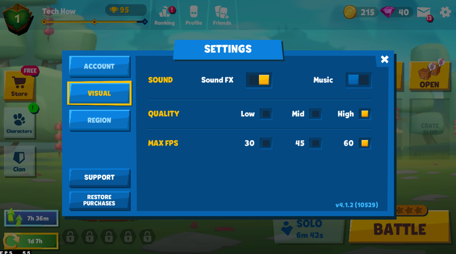 After completing the initial tutorial, navigate to your in-game settings. If you experience lag or otherwise low performance while playing the game, then reduce your visual settings. The Quality and Max FPS options will be set to their highest values when launching the game using the BlueStacks emulator. Set the Quality option to Medium and play a game to see if it helps with low performance.