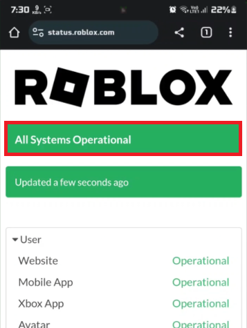 It's prudent to check the status of Roblox game servers as they could be at the heart of the issue. Launch your mobile browser and navigate to status.roblox.com. This portal provides a snapshot of the Roblox server status for the mobile app, games, and other functionalities.