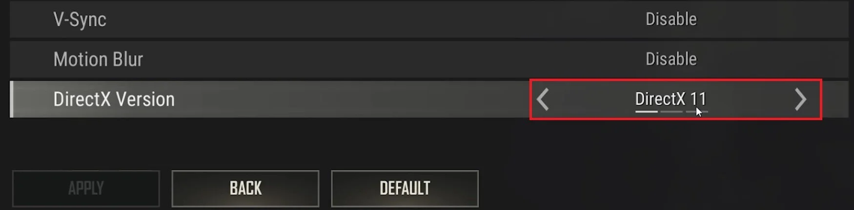 PUBG Settings > Advanced > DirectX Version