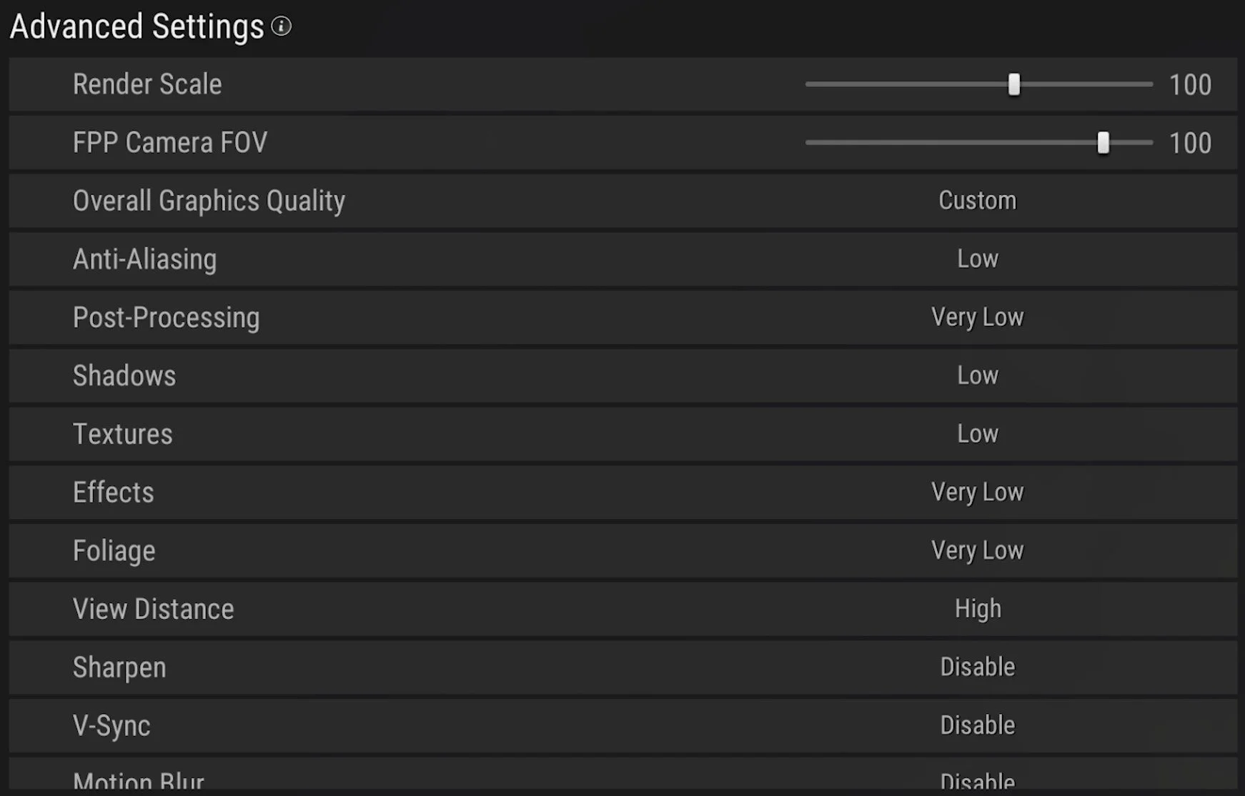 Your Advanced Settings will largely depend on your system specifications, and we advise you to play a game to test out your settings to tweak them, later on, to see if you have some performance to spare. Set your Render Scale to around 95%. This setting can reduce the stress on your GPU when reducing it, but the visual quality will suffer a lot. I like to use a high Field of View for the first-person camera perspective, but this will come down to personal preference.