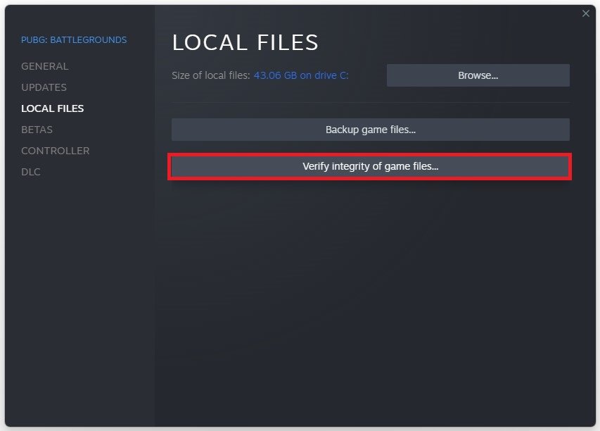 Right-click PUBG and select Properties. In the Local Files tab, select Verify integrity of game files on this window. Redownloading and replacing any missing or corrupted game files will take a minute.