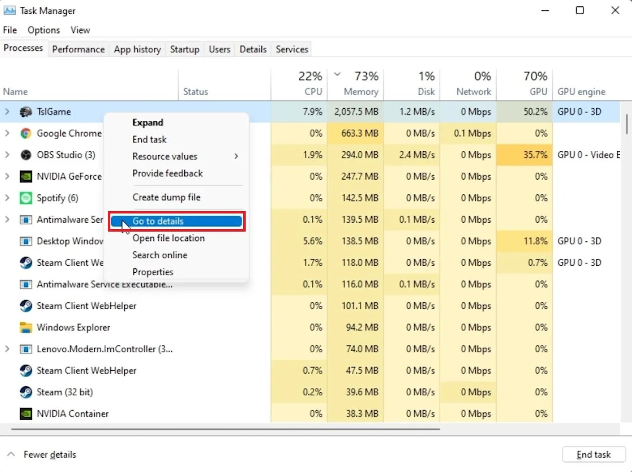 Leave the game running and open your Task Manager by searching for it in your Start Menu search. In the Processes tab, right-click the TslGame process and select to go to Details.