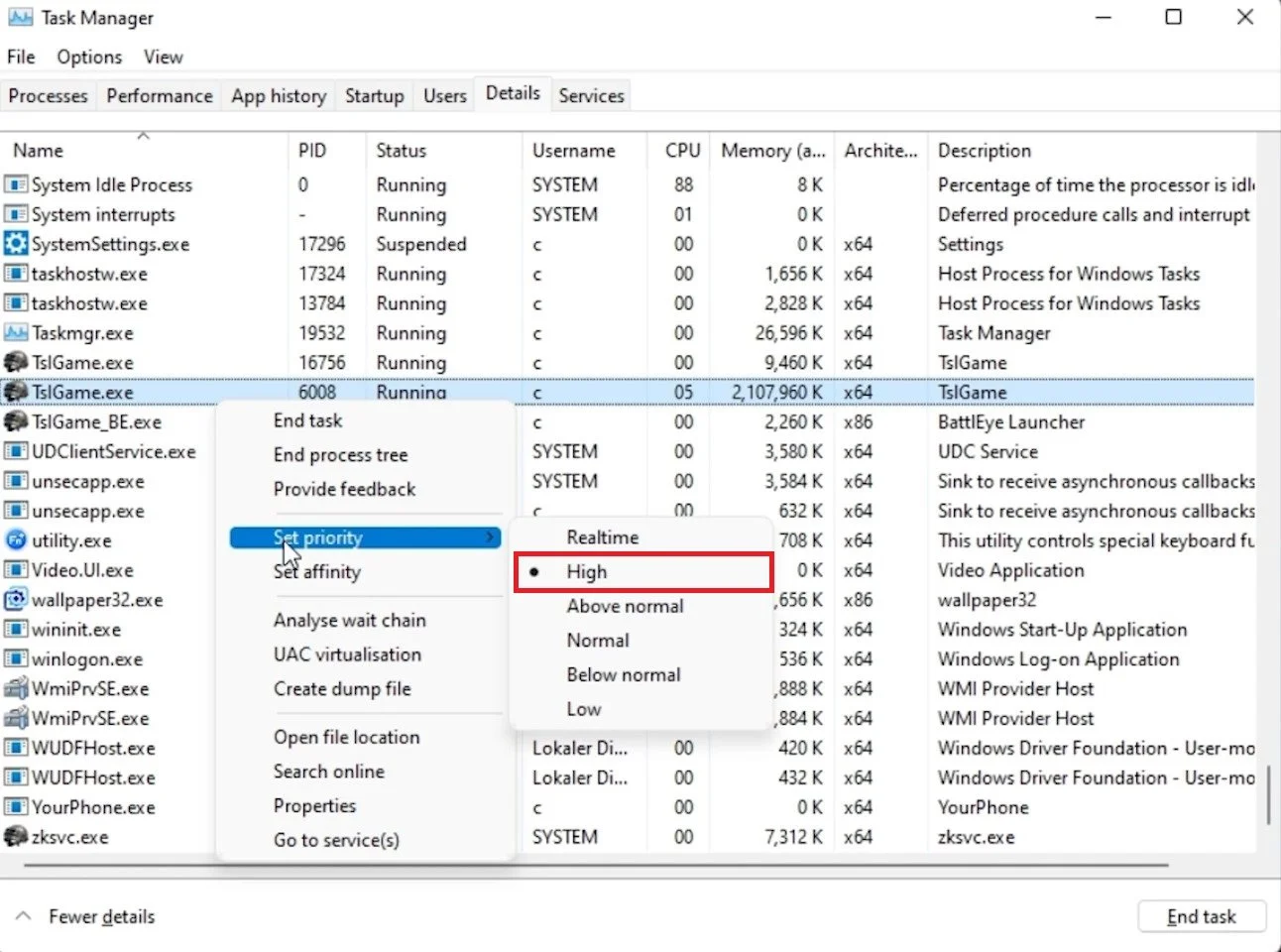 In the Details tab, the TslGame.exe process with the highest memory allocation should be highlighted. Right-click the process and set its priority to High.