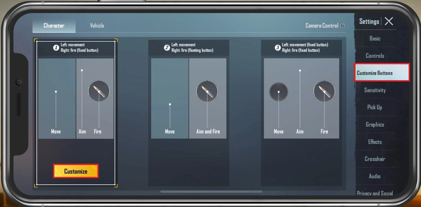 Under Customize Buttons, choose whether you have a fixed or floating fire button. When tapping on Customize, you can change the location of each button.