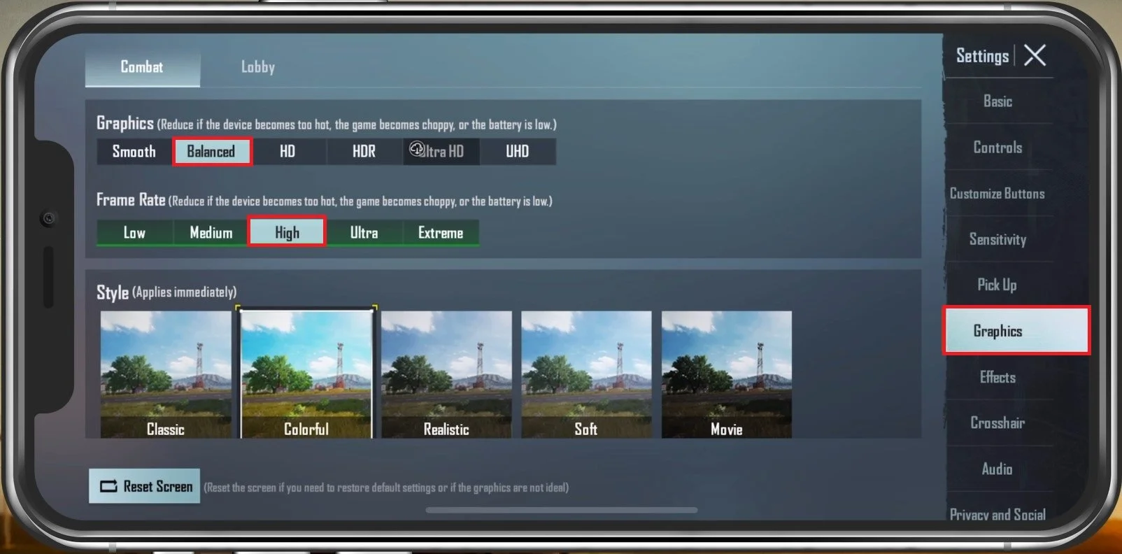Your Graphics settings will have a lot of impact on the performance and quality of your gameplay. I will set these for a low to mid-end device as it will also reduce distractions generated by the game and will help you run PUBG mobile smoothly on any mobile device you wish to use. The overall Graphics setting should be set to Smooth or Balanced. Balanced will allow the game to change your Graphics setting according to your device’s available resources, which I use on an iPhone 11 Pro Max.