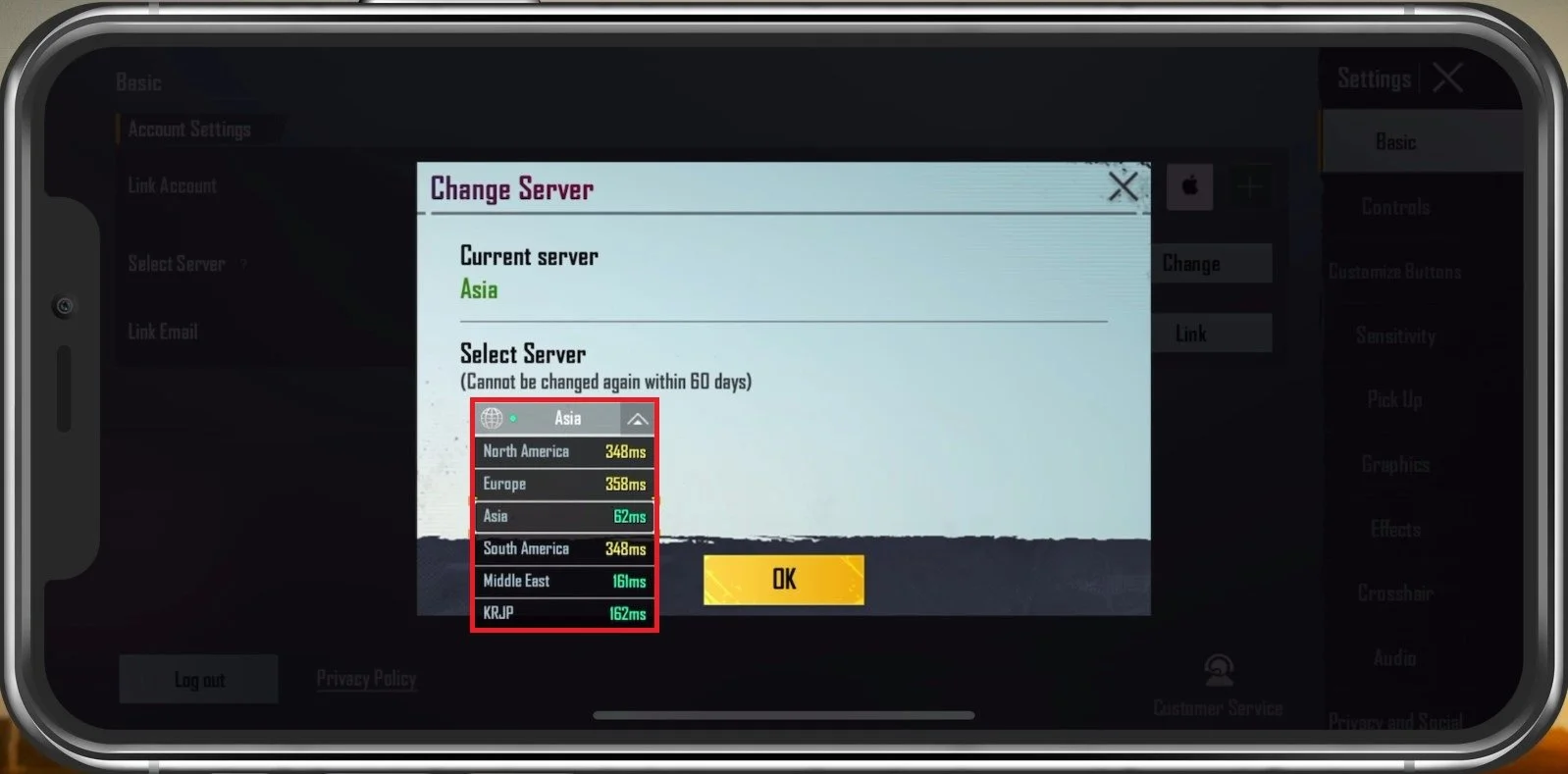 Open up PUBG mobile and navigate to your settings. In the Basic tab, you can change your server location. When tapping on it, you can preview your ping to all the available servers in the list. I suggest picking the one with the best connection. Once selected, you can not change it again within 60 days.