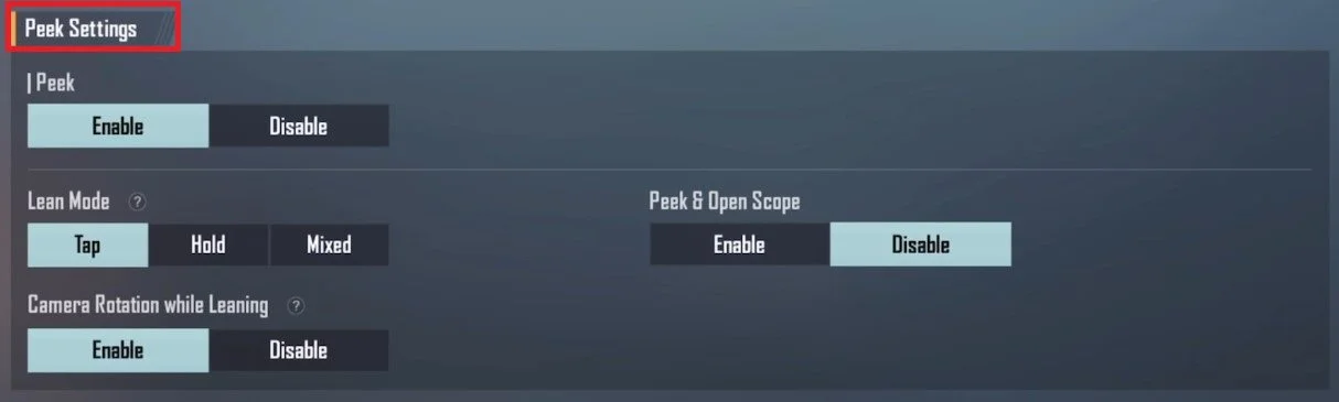 Enable the Camera Rotation while Aiming Down Sights option in your Scope Settings. Below, enable the Peek setting, which will help you a lot while playing the game. Set the Learn Mode to Tap and enable the Camera Rotation while Leaning option.
