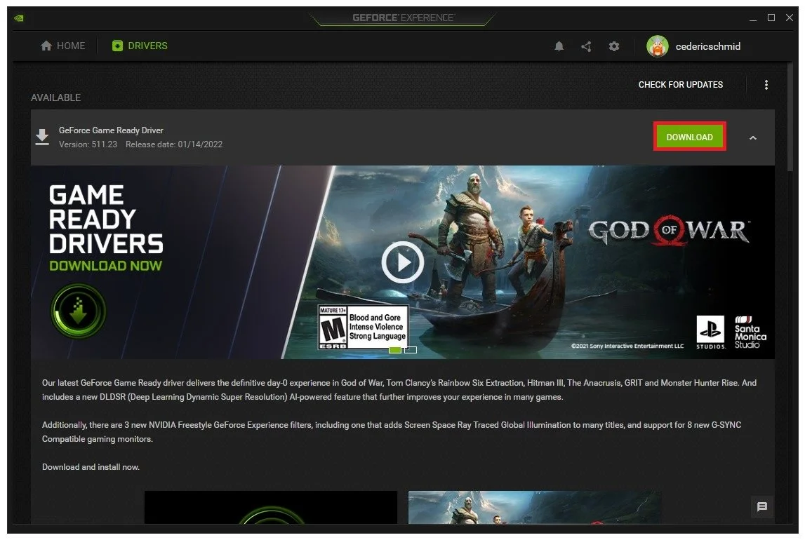 Ensure that your graphics driver is up to date. You can manually download and install the latest driver, and we suggest using the GeForce Experience application for NVIDIA users. This will allow you to download and automatically install the latest GPU driver easily. In the Drivers tab, click download, and the application will automatically download and install the latest driver.