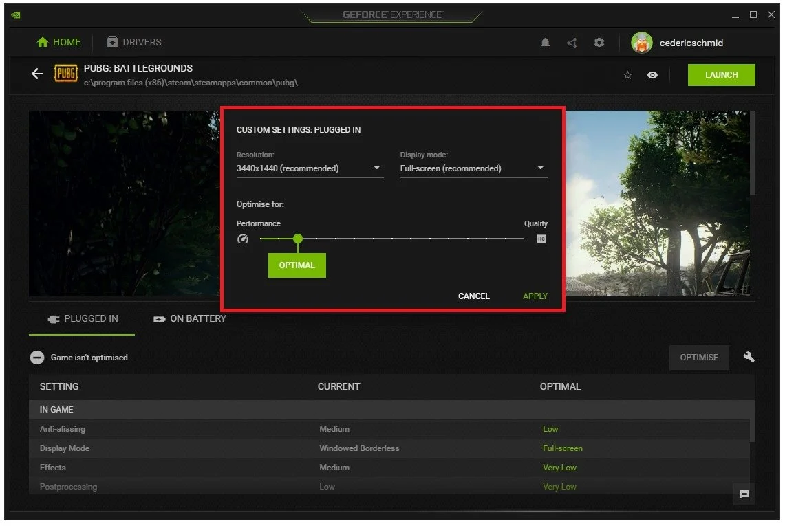 Navigate to the Home in the GeForce Experience application. Click on Details for PUBG to preview the optimal suggested in-game settings here. When clicking Optimise, GeForce will apply the optimal settings according to your system specs. When clicking the wrench icon, you can use this slider system to increase your performance by setting it to Performance. You also have the option to change your in-game Resolution and Display Mode from here.