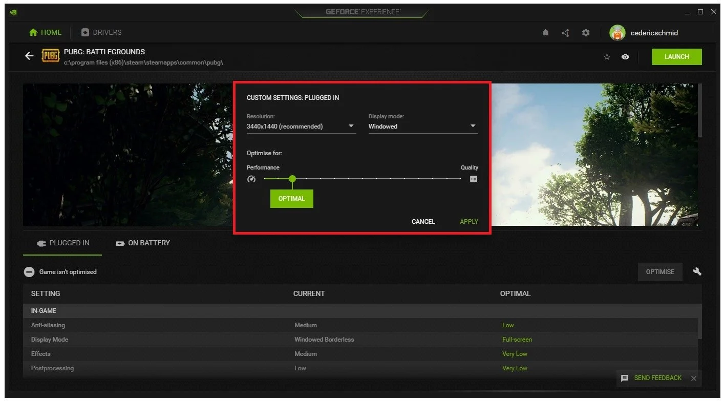 In the Home tab, select Details for PUBG. Click on the wrench icon to access your PUBG custom settings. Set the Display Mode option to Windowed for now; you can change it back to fullscreen in your in-game settings. You should also use your recommended native monitor resolution in the Resolution setting.