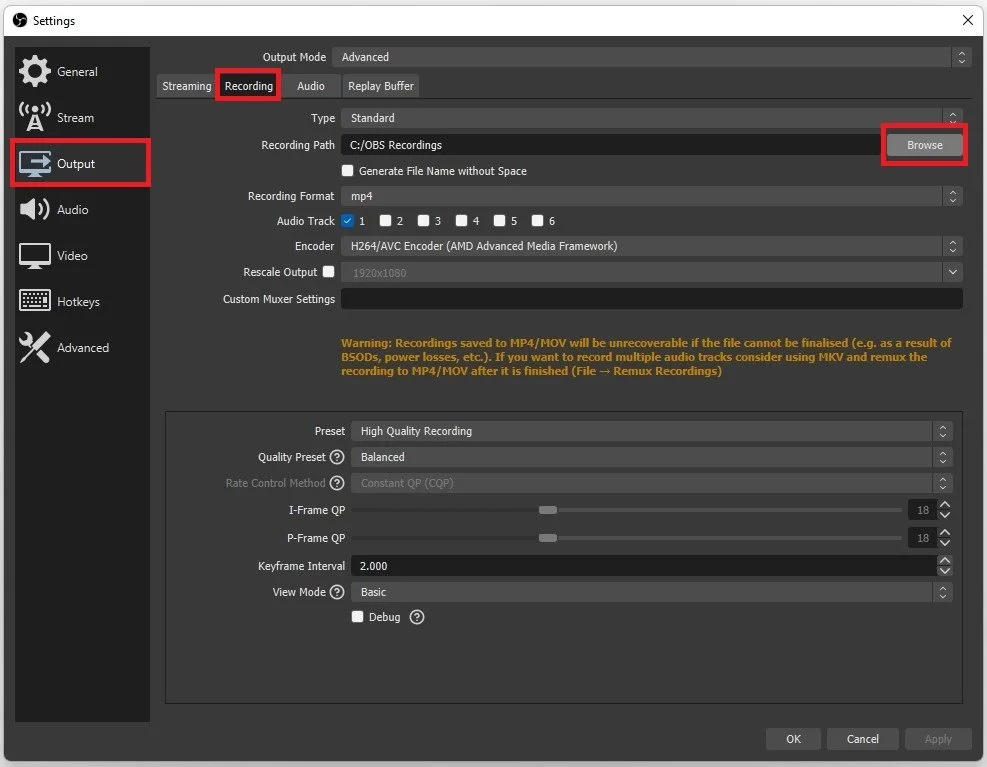 Under Output, navigate to the Recording tab. Here, you have the option to change your Recording Path. Click on Browse, and here choose an existing or create a new folder in your file explorer where your OBS recordings should be saved.