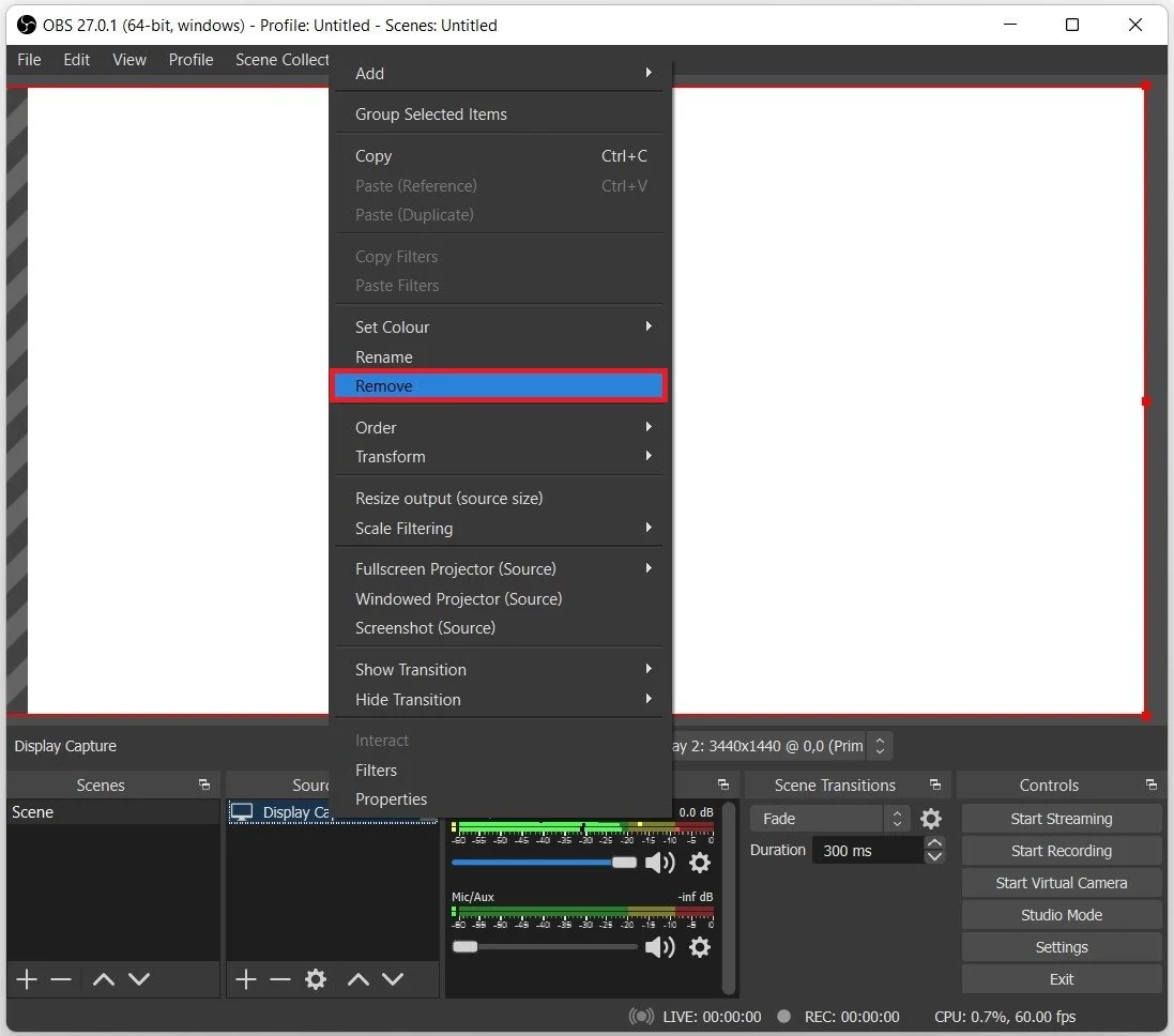 Under Advanced, I suggest setting the Process Priority option to Above Normal. This will make sure that OBS will run fine if other resource-intensive applications are also running on your PC. After applying your changes, you can record your computer screen for free using OBS Studio. To delete a source, right-click it and select Remove.