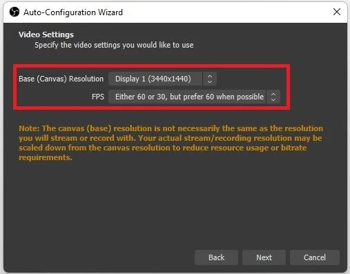 Click on Next, and here make sure to set the Base or Canvas resolution to your native monitor resolution. In our case, that would be 3440x1440. Set your FPS option to Either 60 or 30, but prefer 60 when possible. This will allow OBS to choose the best option, depending on your CPU and GPU usage. Apply these changes if it’s the first time setting up your OBS settings.