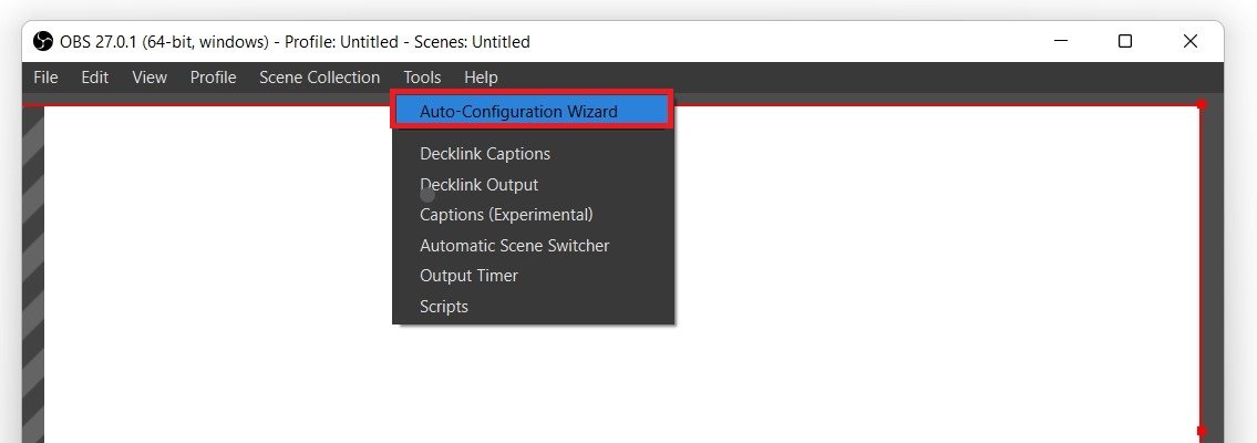 It would be best to use the Auto-Configuration Wizard to optimize your OBS recording settings quickly. Under Tools, select the Auto-Configuration Wizard option, and you will be presented with three options.