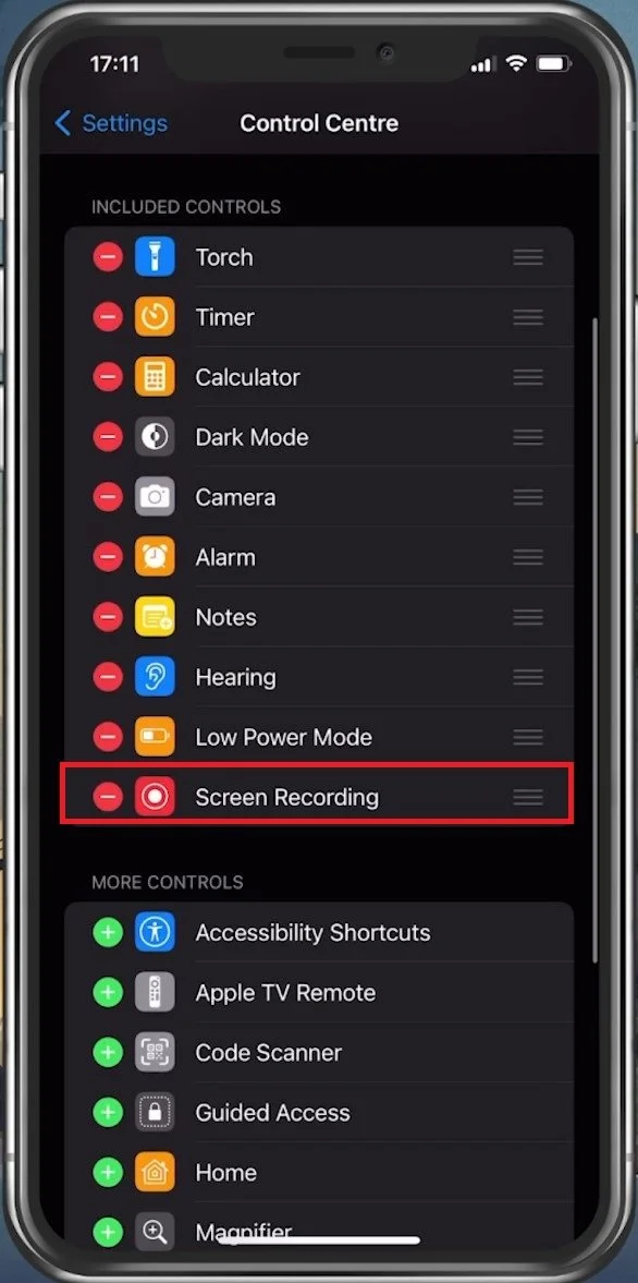Enable Screen Recording in the Control Centre