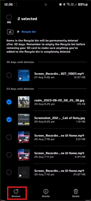 Select Deleted Photos: Once in the Recycle Bin, sift through the files and tap on the photos you want to bring back.