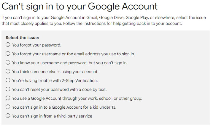 In circumstances where you can't sign in due to reasons apart from forgotten password or email, Google's Help Center is your go-to. Depending on your specific issue, whether it's a forgotten username or recovery email, the Help Center guides you through relevant steps to verify your account.