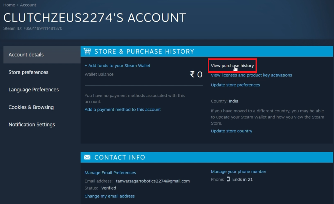 Scroll down to locate the "View purchase history" section, where a record of all your transactions is maintained.