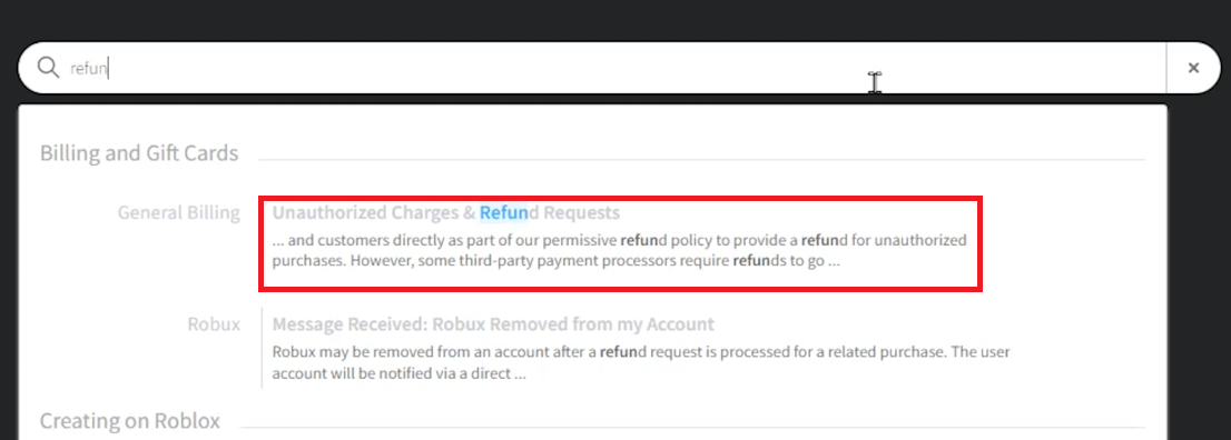 In the search bar presented, input 'Refund' and select the first option that pops up, namely 'Unauthorized Charges and Refund Requests'.