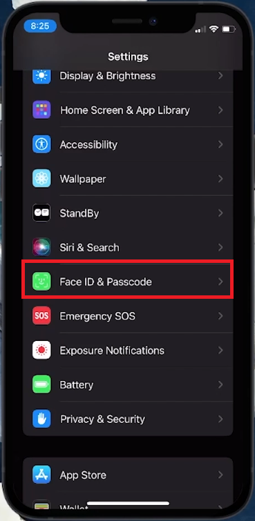 In Settings, scroll to find either “Face ID & Passcode” or “Touch ID & Passcode”. The option varies depending on your iPhone model.