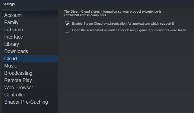 Open your Steam launcher and ensure you’re logged in with your account. Click on Steam on the top left of this window to access your Steam launcher settings. In the Cloud section, ensure that this “Enable Steam Cloud synchronization for applications which support it” option is toggled on.